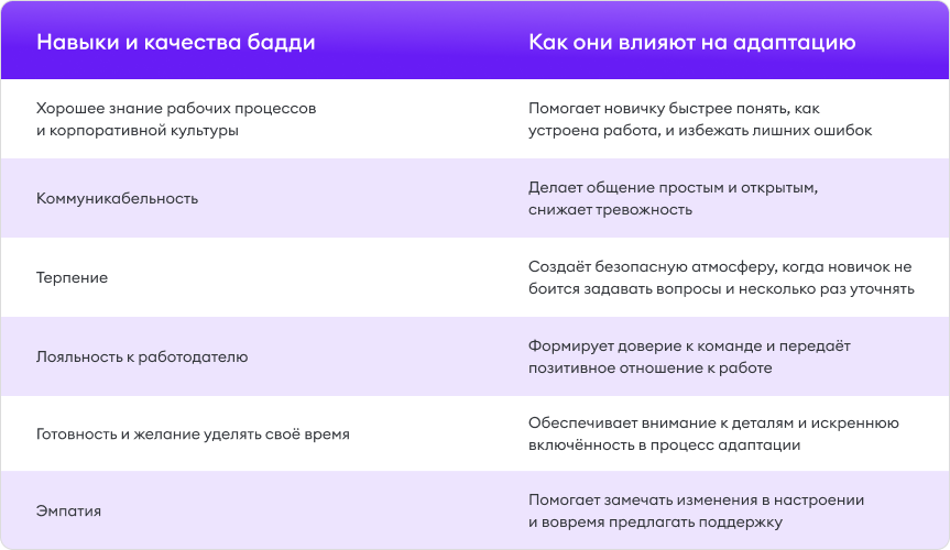 Важно донести, что бадди — это не «универсальный помощник», а поддержка в адаптации. Такой инструктаж снижает риск недопонимания, помогает до конца осознать важность новой роли.